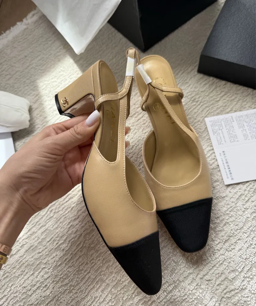 Chanel Beige And Black Leather Cap-Toe Block Heel Pumps