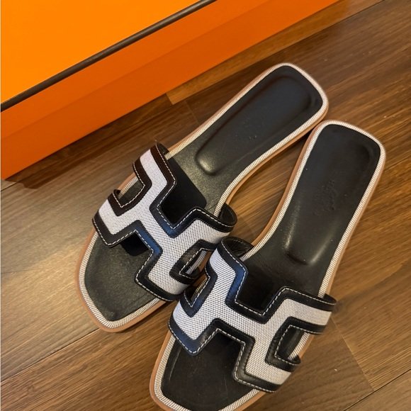 Hermes Oran Sandals Black White